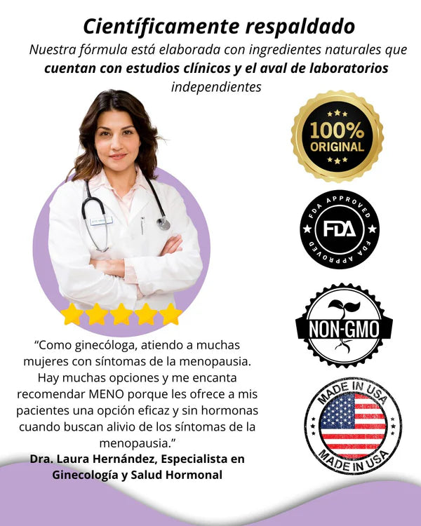 Meno está elaborado con ingredientes naturales y no contiene hormonas. Sin embargo, si tienes una condición médica como hipertensión, diabetes o tiroides, o si tomas medicamentos de forma regular, lo más recomendable es consultar con tu médico antes de empezar a usarlo.